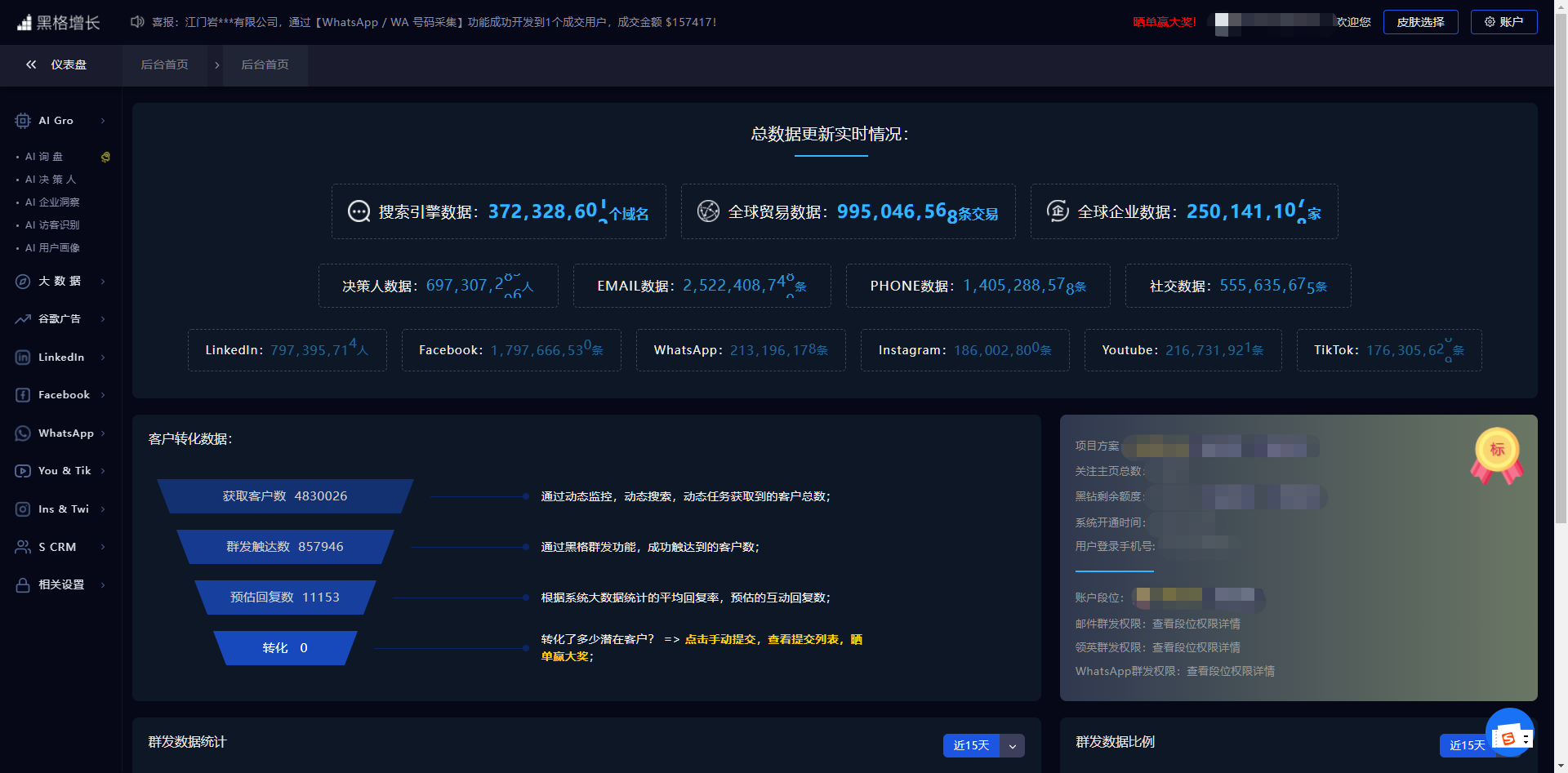 通过HaGro爬虫系统,动态抓取相关社交平台上实时更新的WhatsApp号码,先人一步掌握最新潜客信息。支持导出和群发,减少开发耗时,为外贸人的客户资源库添柴加火。